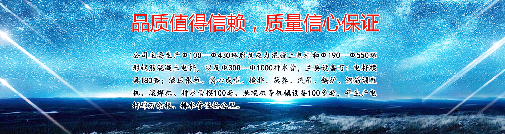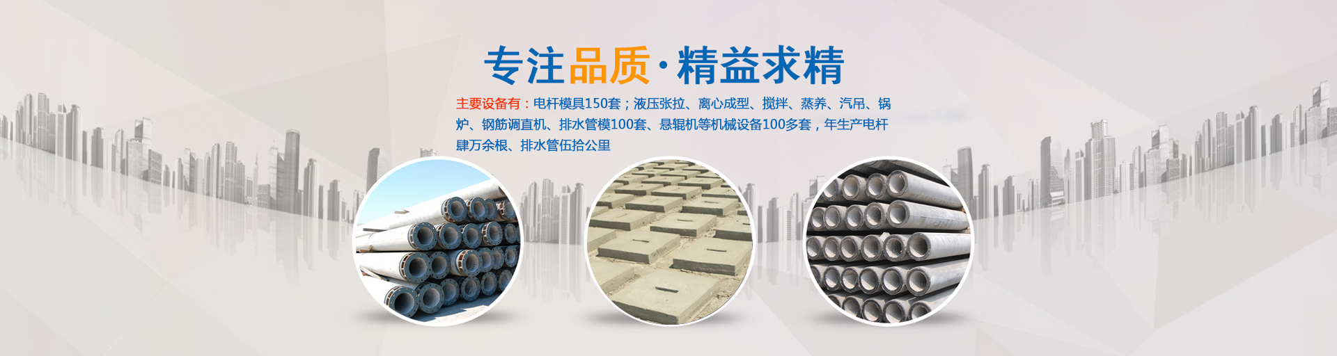 公司主要生產(chǎn)ф100—ф430環(huán)形預(yù)應(yīng)力混凝土電桿和ф190—ф550環(huán)形鋼筋混凝土電桿,以及ф300—ф1000排水管,主要設(shè)備有:電桿模具180套;液壓張拉、離心成型、攪拌、蒸養(yǎng)、汽吊、鍋爐、鋼筋調(diào)直機(jī)、滾焊機(jī)、排水管模100套、懸輥機(jī)等機(jī)械設(shè)備100多套,年生產(chǎn)電桿肆萬(wàn)余根、排水管伍拾公里。……